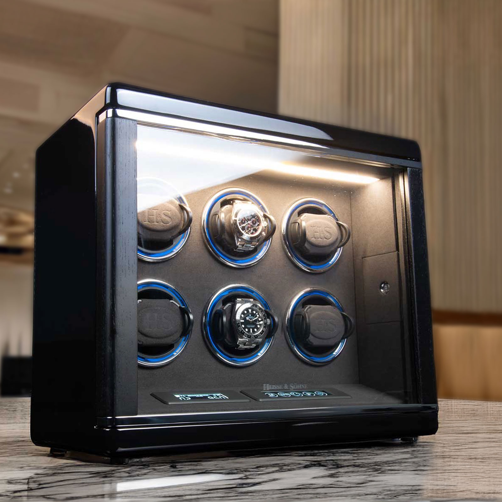 Inside the watch winders works the latest H&S Premium-Drive technology from Heisse & Söhne, ensuring a gentle, quiet, and durable winding of your watches. The individually programmable, five-ball bearing modules enable smooth winding even of the heaviest watches. A modern H&S LCD-Control facilitates the intuitive programming of the turns per day (450-1500 / 8 steps) as well as the rotation direction (right, left, alternating).